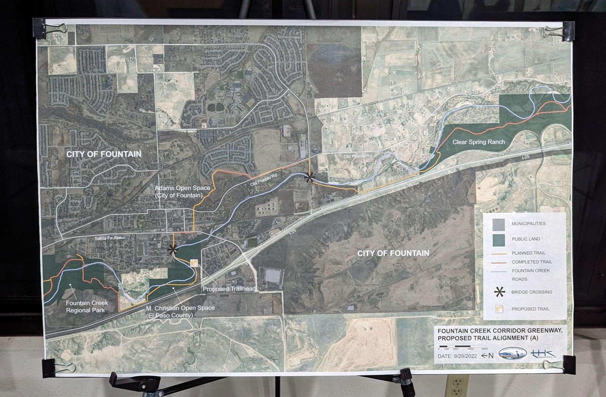 On Thursday, December 20th TOSC staff joined Allison Plute Schuch, the newly appointed Executive Director of the Fountain Creek Watershed Flood Control and Greenway District, as she facilitated the last public meeting scheduled for the Fountain Creek Corridor Grenway Master Plan. This plan sets the vision for the eventual trail that will connect the southern portion of Colorado Springs and Fountain (via the Fountain Creek Regional Trail) southward to the El Paso County Parks Clear Spring Ranch property. Then continuing on along the creek corridor to Pueblo. We are happy to report that the City of Fountain is moving forward with establishing a new trail connection that will include the Christian Open Space property, not currently open to the public, and additional urban trail connections in the city. The entire trail corridor is 46 miles in length and we look forward to partnering with the FCWD as they work to create additional trail access between our southern communities.