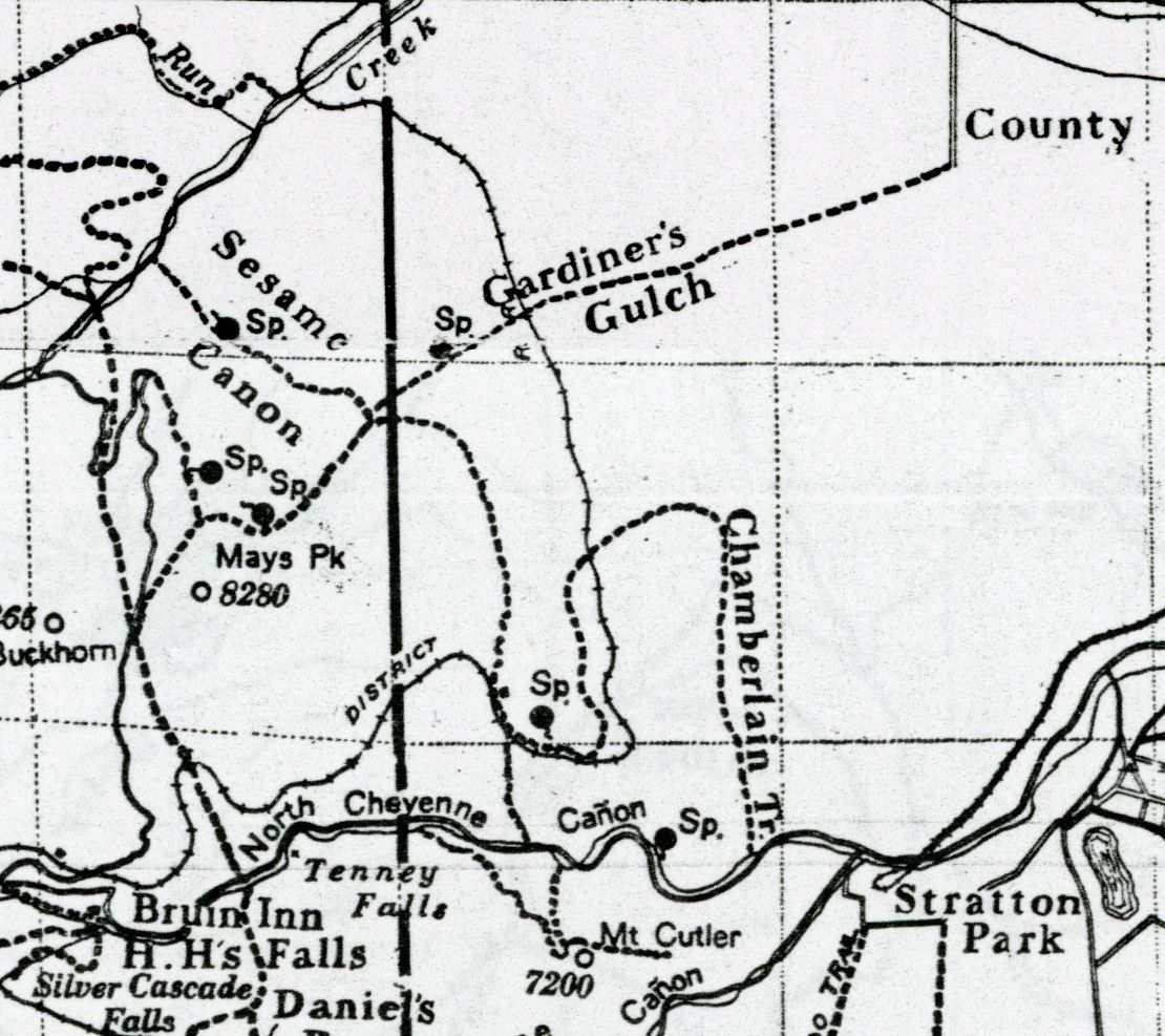 On the 13th of June, 1925, Frank C. Chamberlain of Los Angeles, California, sold his 200 acres to Fred W. Chamberlain of El Paso County Colorado (green and purple outlines). It is not clear what Fred did with the land between 1925 and 1937, but it is clear the trail from North Cheyenne Cañon road to Point Sublime was already there, as shown on Ormes map, below. It seems appropriate the Chamberlain trail be named after both Frank and Fred.