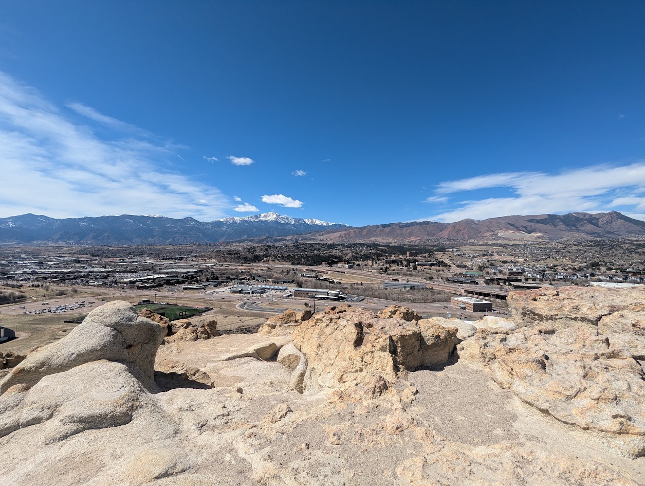 The elevated bluffs provide sweeping views across the city, Garden of the Gods, and toward Pikes Peak, making the area especially popular at sunrise and sunset.