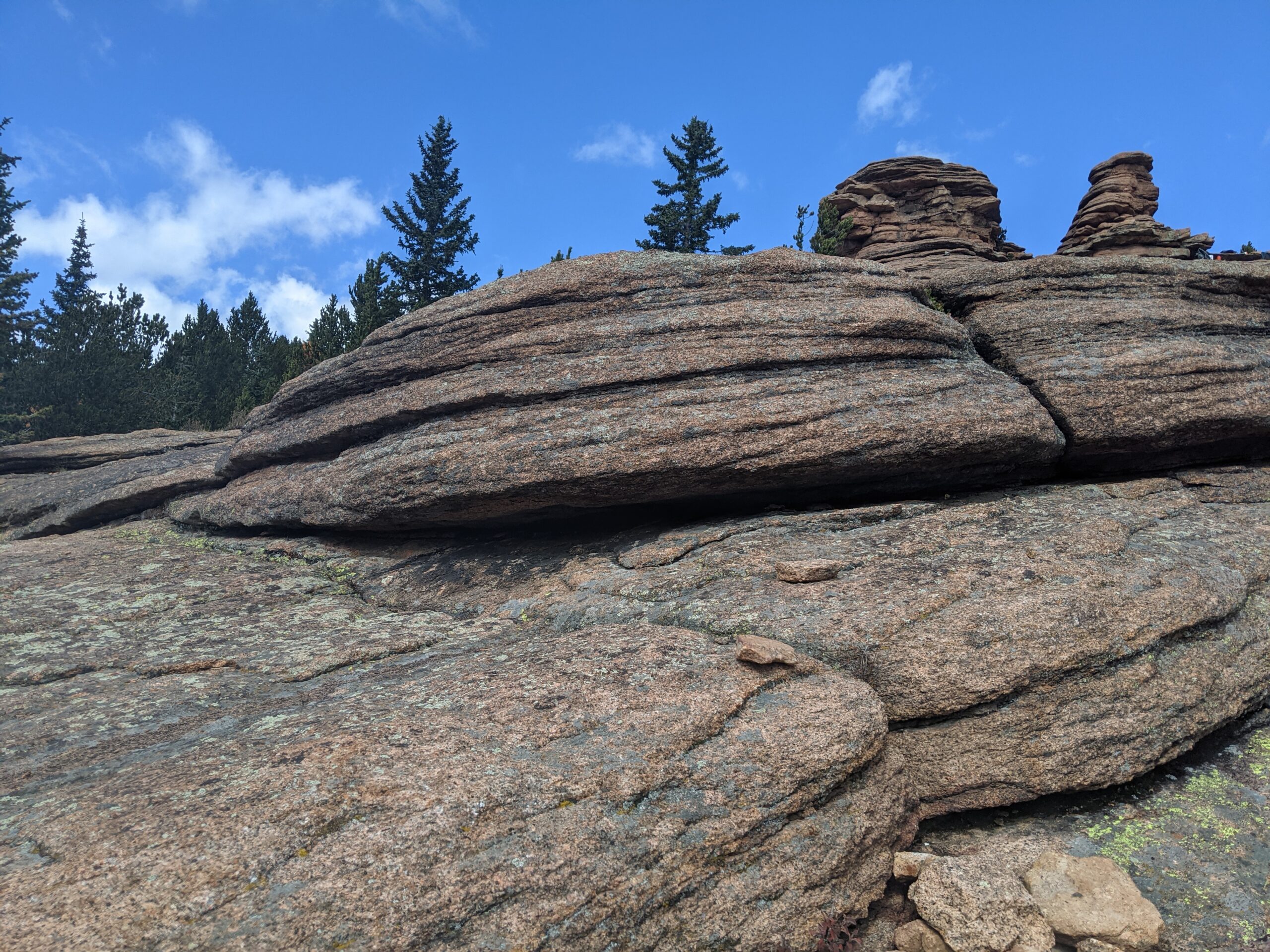 The trail to Pancake Rocks begins from Horsethief Park and climbs steadily through spruce and fir forest. Hikers can expect about 6 miles round trip with roughly 1,200 feet of elevation gain, making it a moderate-to-challenging trek. The highlight is reaching the natural sandstone and granite formations, where the rock has weathered into stacked, flat shelves that look like giant pancakes tipped on their side.
